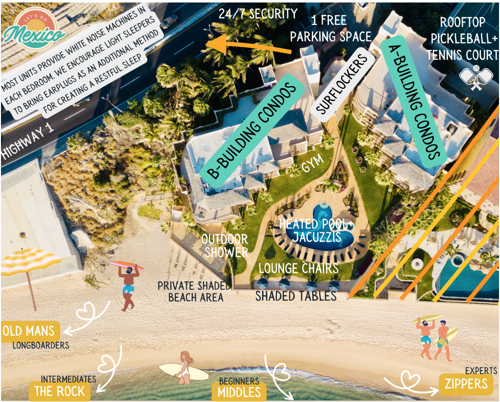 This is a rare stretch of swimmable beach, with multiple surf breaks directly in front of the property. Amenities include a heated pool, adult-only jacuzzis, rooftop tennis/pickleball courts, plus shaded tables overlooking the beach and plenty of comfortable lounge chairs for laid-back pool and ocean days. You’re also within walking distance to several beachfront restaurants, and close to downtown San José del Cabo and major grocery stores for easy supply runs.